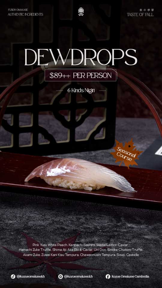 - KOZUE has expanded its operations to Cambodia by RDP Group, opening its first and largest branch in the country. This marks a significant milestone for the brand and brings improvements to the price, quality and value of the omakase landscape in Cambodia.